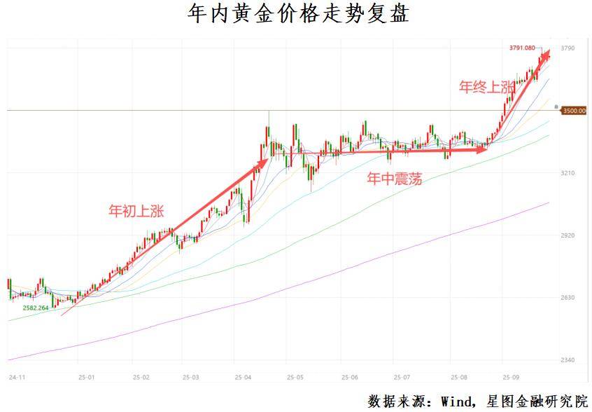 回顾年内走势,黄金自年初强劲上涨,4月22日最高触及3500美元。此后金价高位震荡,多次上攻均未站上。直至8月下旬,买盘力量重新集聚,9月2日有效突破3500美元关键阻力后稳步上行,目前已站稳3800美元上方。