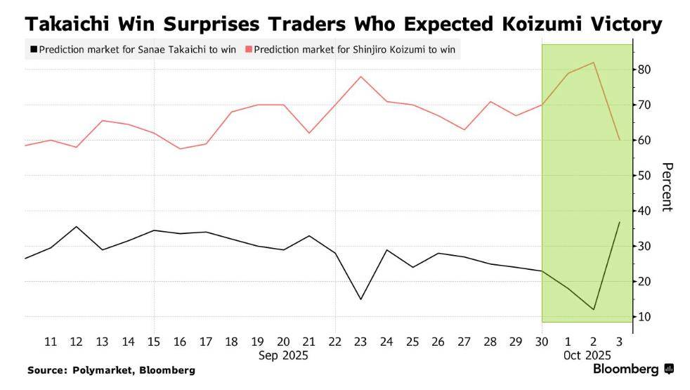 在上周六赢得自民党领袖选举后,高市早苗有望成为日本首位女首相。投资者此前曾预计这一职位将由政治世家子弟小泉进次郎(Shinjiro Koizumi)担任,外界认为小泉进次郎在财政方面更为谨慎,并会让日本央行推进政策正常化。