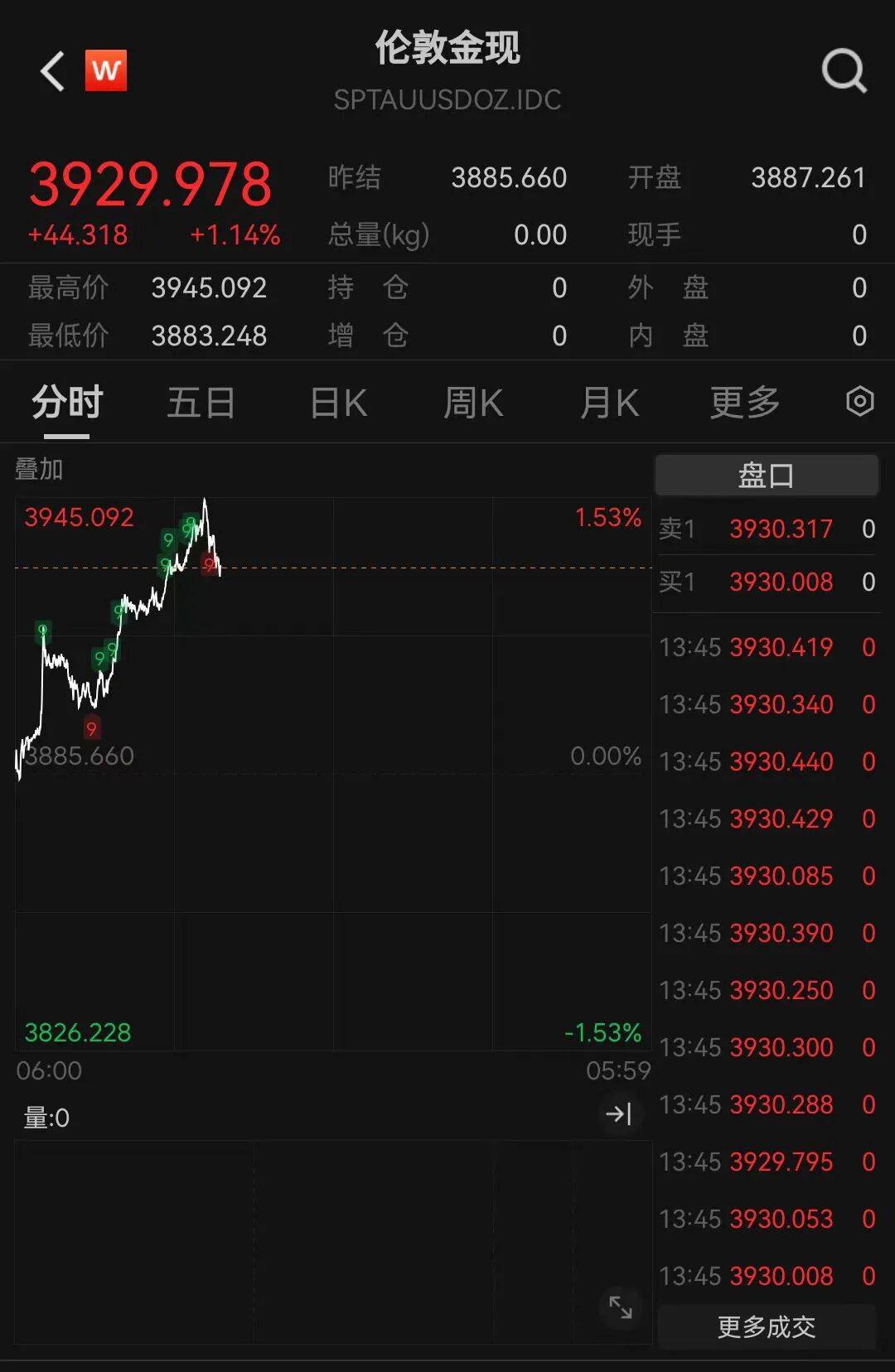 现货黄金向上触及3940美元/盎司,日内涨1.38%,年内累涨逾50%。