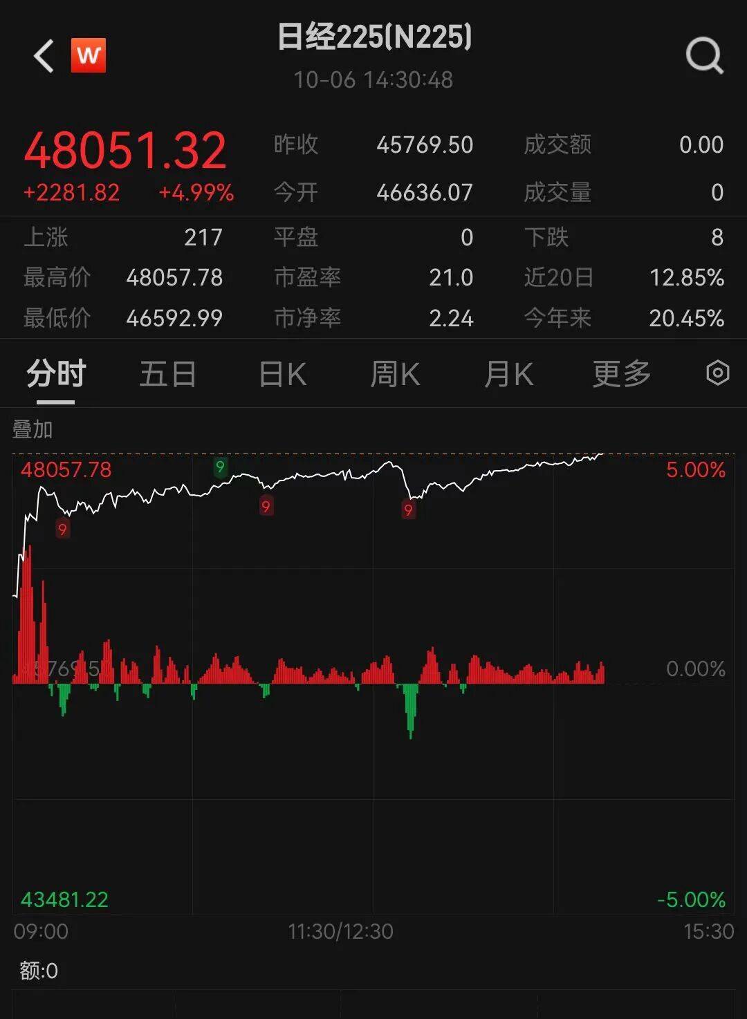 10月6日午后,日经225指数首次突破48000点,涨幅超5%。