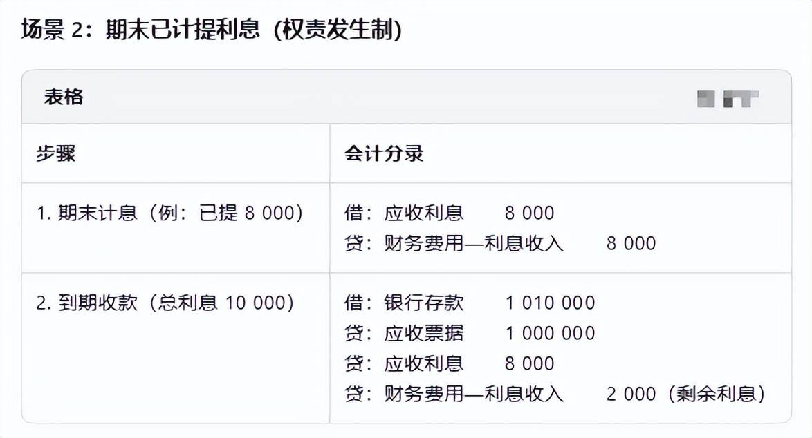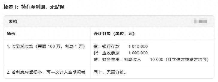 4、若票据已贴现,贴现息已一次性计入“财务费用—贴现息”,到期银行与本公司无关,不再确认利息收入。
