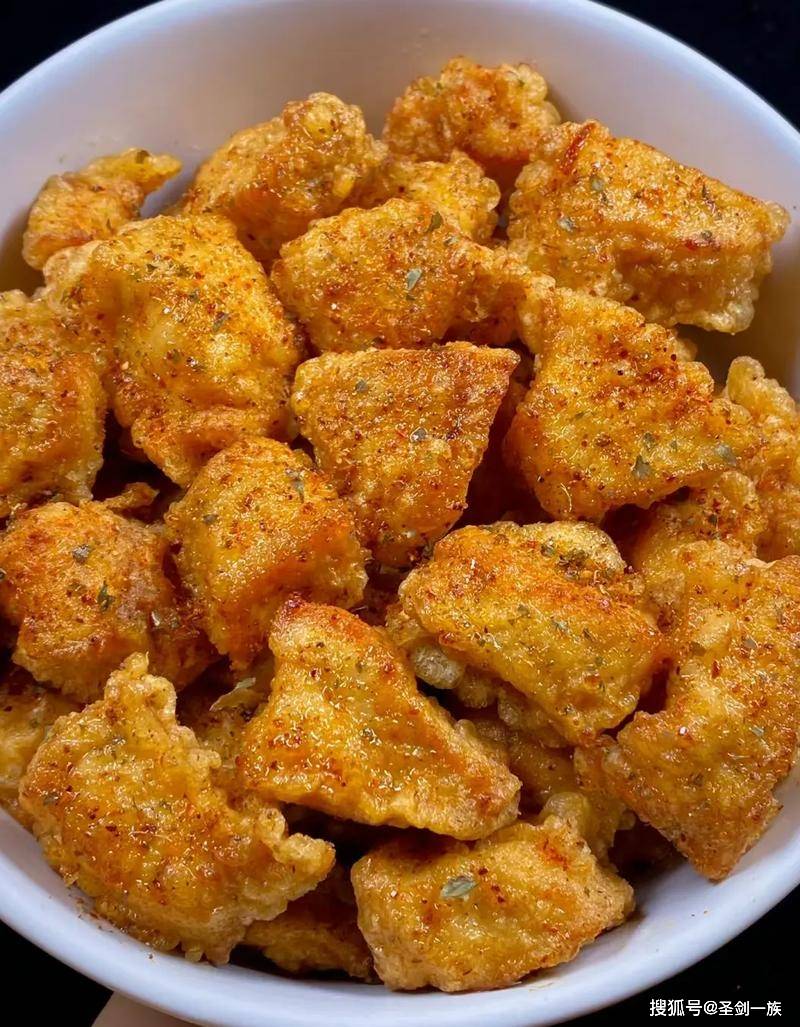 4.锅中倒油,油温烧至六成热,(此时放入筷子,周围便会有小气泡冒出),接着把裹好面糊的鸡胸肉放入锅中,炸至其表面微黄后捞出;待油温再次升高,将鸡胸肉复炸至金黄酥脆,捞出后撒上椒盐与辣椒粉便可。