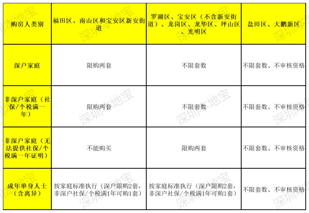 深圳户籍居民家庭限购2套、在深圳连续缴纳社会保险或个人所得税满1年及以上的非深圳户籍居民家庭限购1套。