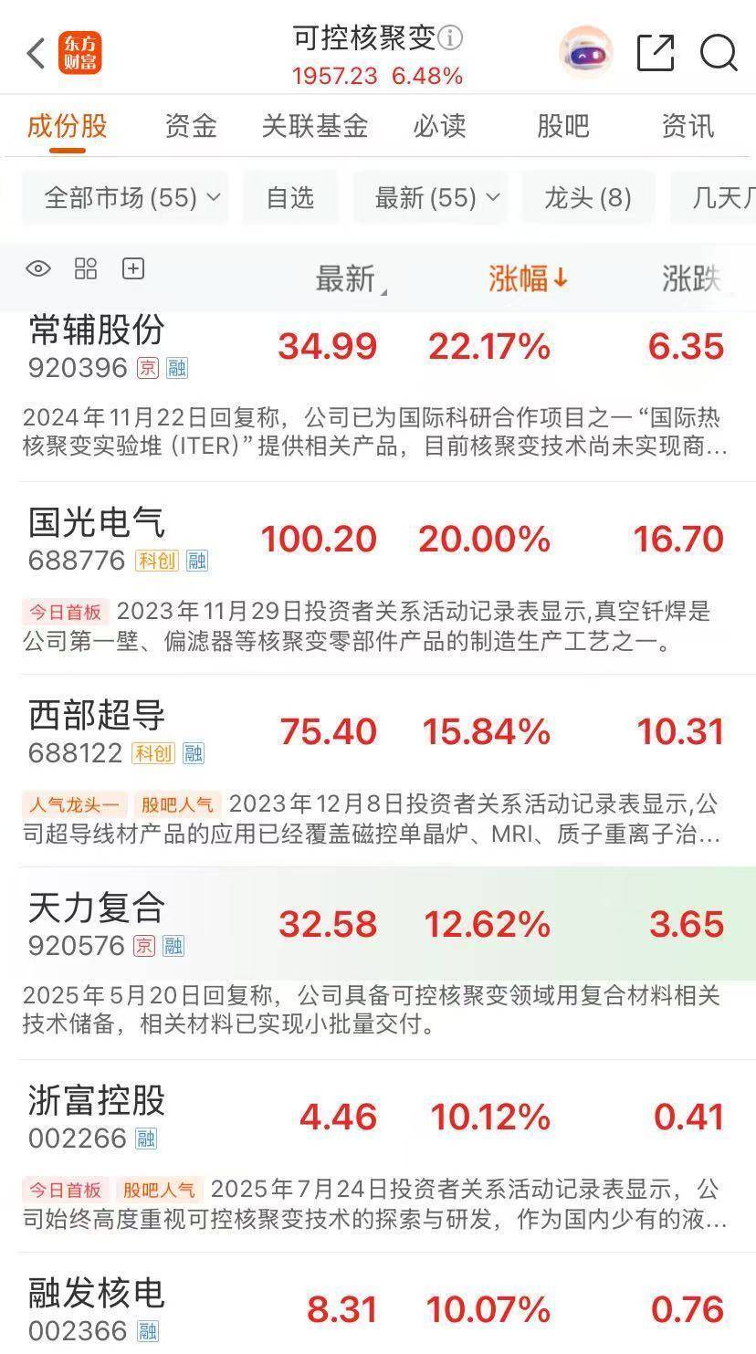 可控核聚变概念走强,哈焊华通、合锻智能、永鼎股份涨停,西部超导、常辅股份、中核科技等涨超10%。