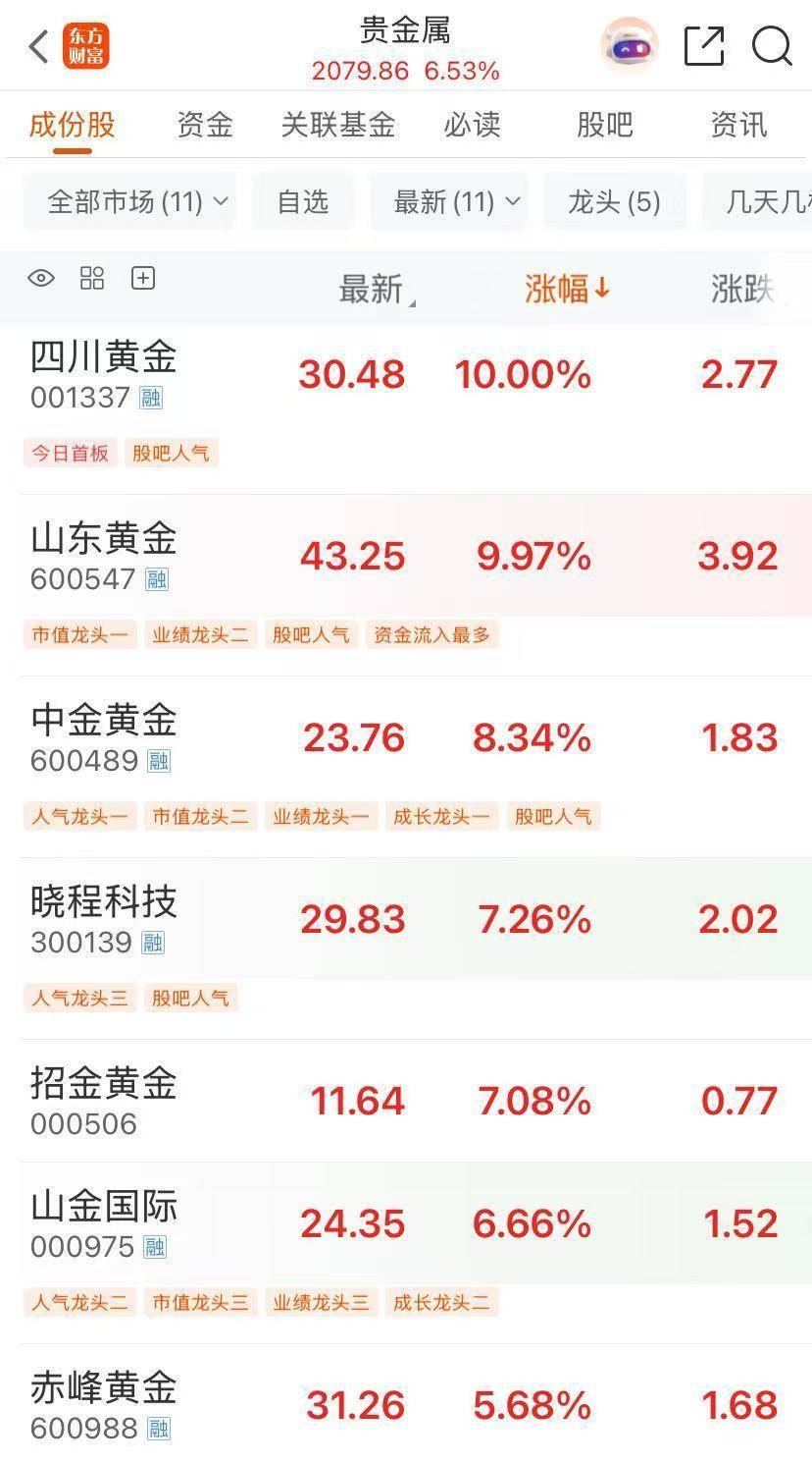 值得一提的是,黄金概念股也大涨,四川黄金涨停,山东黄金涨超9%,晓程科技、中金黄金、山金国际大涨。