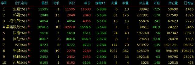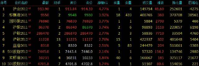 2025年10月9日,早盘收盘,国内期货主力合约涨跌互现。沪金涨超4%,棕榈油、国际铜、沪铜涨超3%,沪银、沪锡、豆油涨超2%;跌幅方面,生猪、液化石油气(LPG)、鸡蛋跌超5%,集运欧线、尿素跌超3%,聚氯乙烯(PVC)、SC原油、甲醇跌超2%。