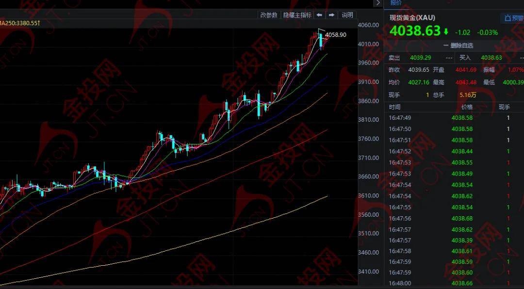 隔夜,现货黄金不仅首次突破4000美元大关,一度刷新历史高点至4059.07美元,最终收报于4039.65美元。今日亚市盘中,黄金忽然转跌,跌幅最高达1%,目前在4038美元附近徘徊。