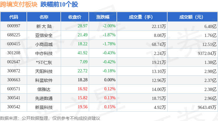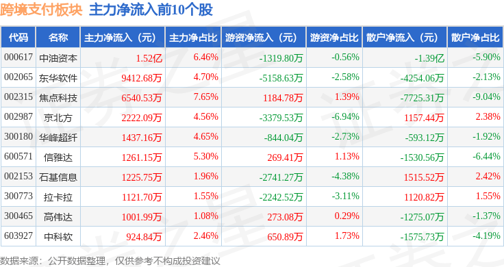 从资金流向上来看,当日跨境支付板块主力资金净流出3.83亿元,游资资金净流入1622.18万元,散户资金净流入3.67亿元。跨境支付板块个股资金流向见下表:
