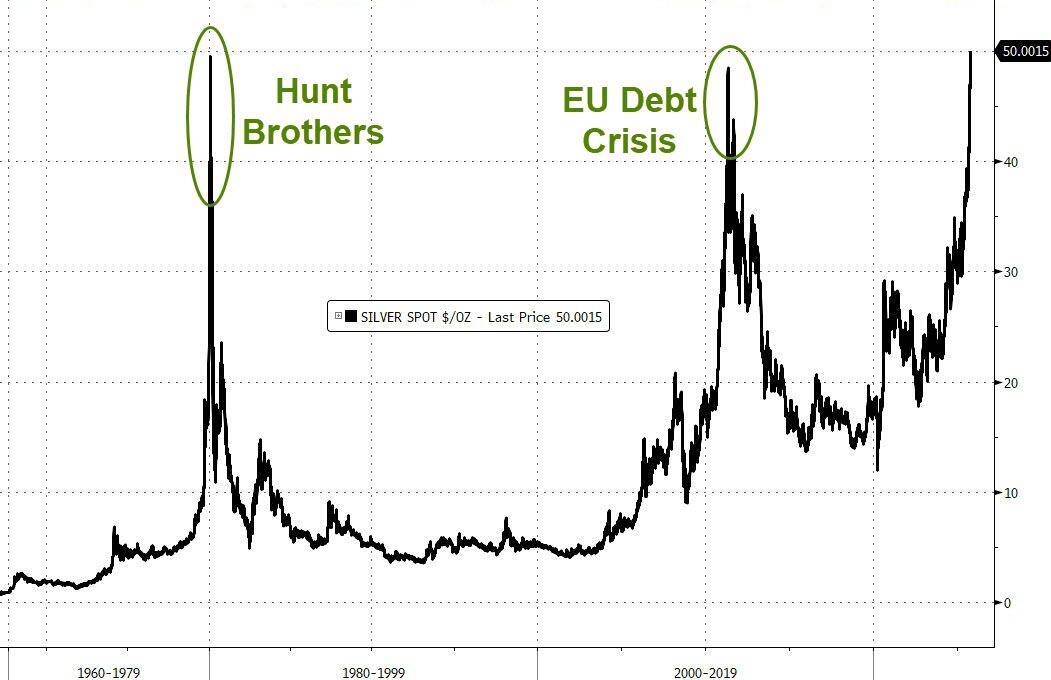 周四,现货白银站上51美元,再创新高,日内涨4.5%。这一价格水平为数十年来最高,仅次于1980年1月亨特兄弟逼空事件期间创下的历史纪录。