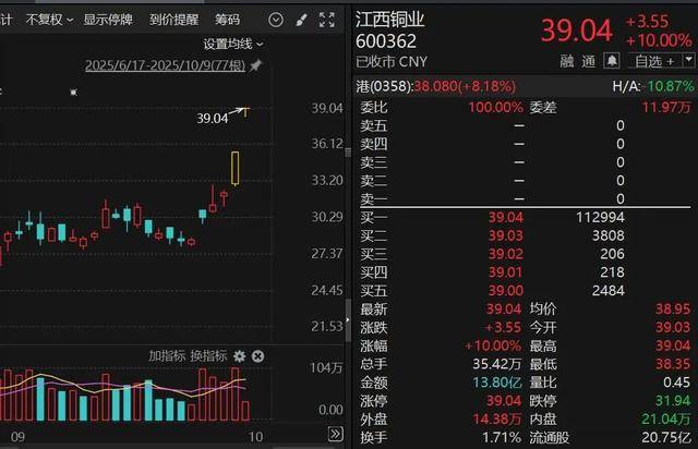 有色板块持续冲高,10月9日铜陵有色(000630)、江西铜业(600362)双双涨停,其中江西铜业更是两连板。
