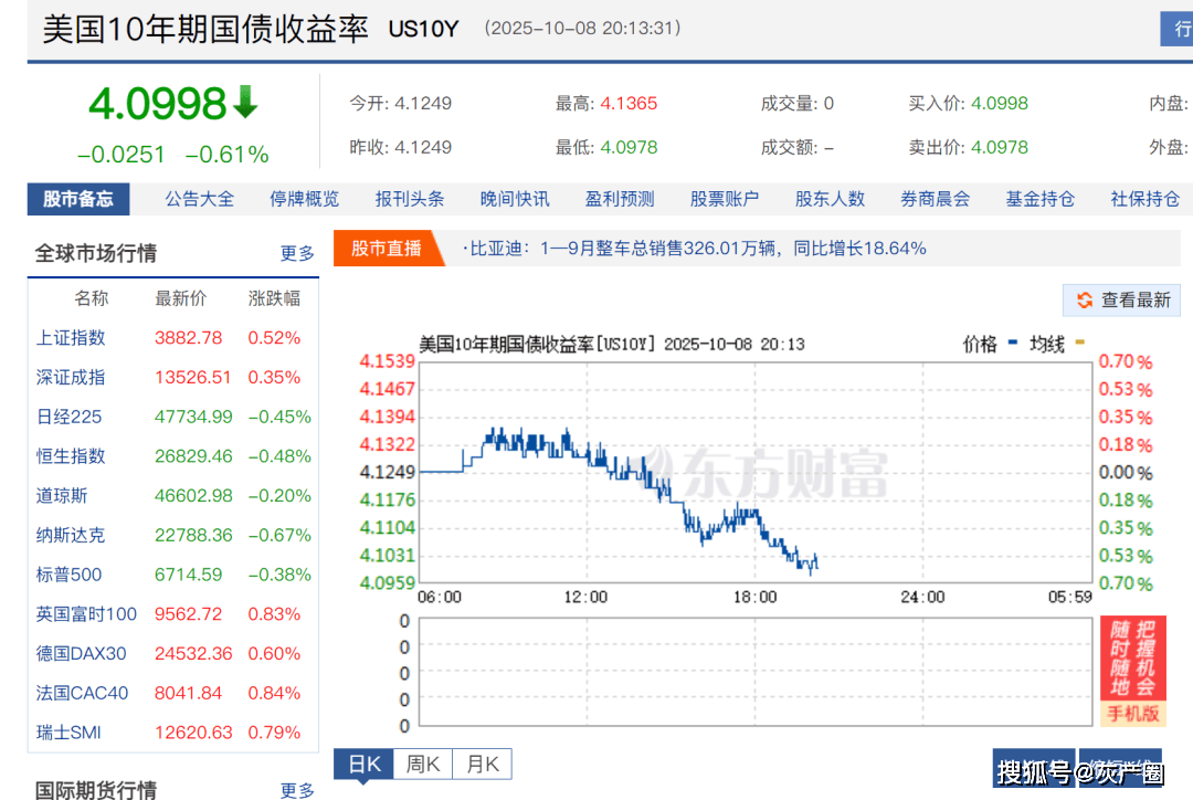 截止10月8日20点,美国10年期国债收益率跌至4.0998%。