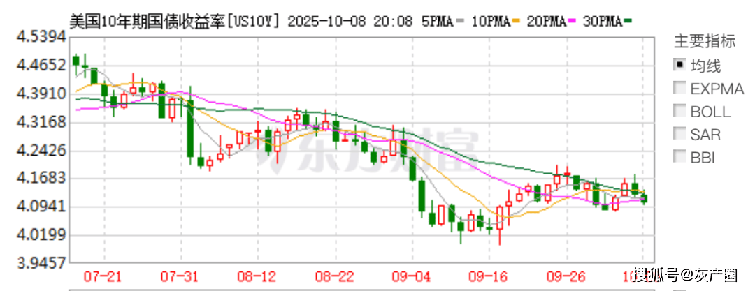 10月7日,美国10年期国债收益率下跌3.3个基点,报4.1191%。