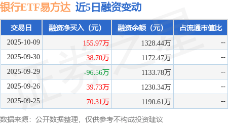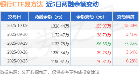 证券之星消息,10月9日,银行ETF易方达(516310)融资买入272.48万元,融资偿还116.51万元,融资净买入155.97万元,融资余额1328.44万元,近20个交易日中有15个交易日出现融资净买入。