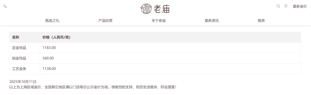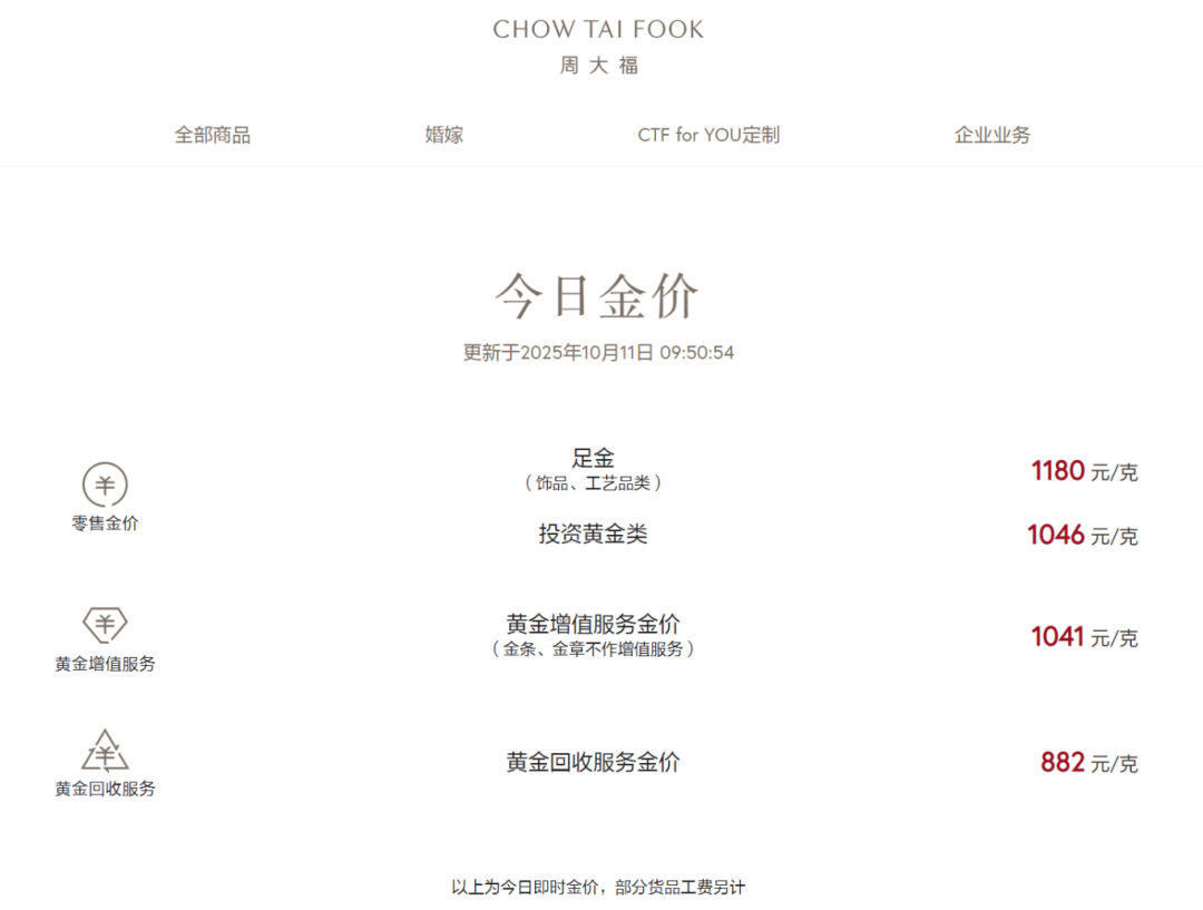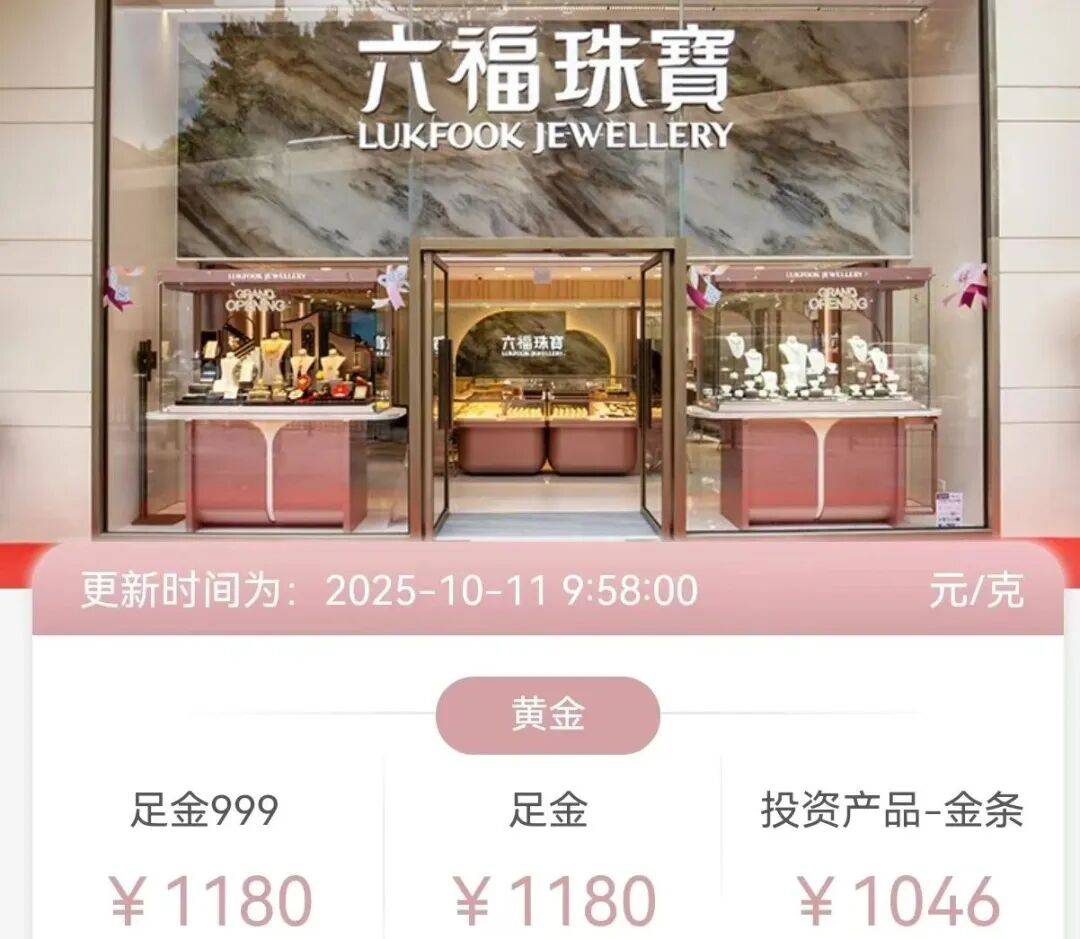 10月11日,国内品牌金饰价格上涨。记者查询到,老庙黄金足金饰品价格为 1183元/克,周大福足金(饰品、工艺品类)价格为 1180元/克,六福珠宝足金首饰价格为 1180元/克。