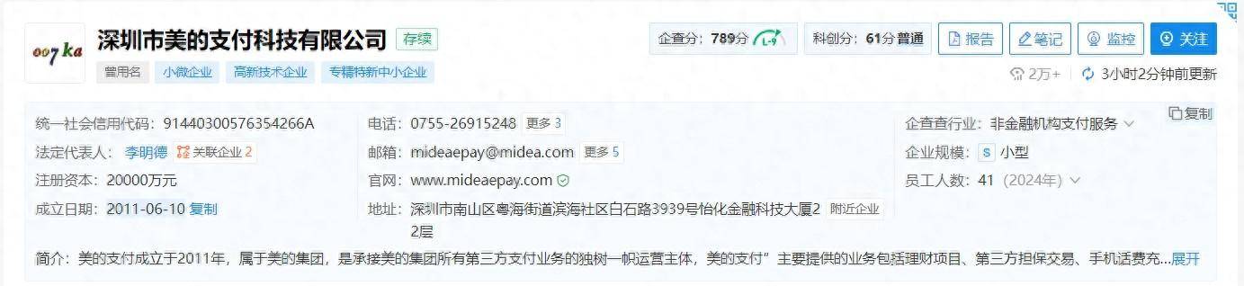 企查查显示,深圳市美的支付科技有限公司成立于2011年6月,由李明德担任董事长。作为美的集团旗下专注第三方支付业务的运营主体,该公司主要开展理财服务、第三方担保交易、手机话费充值、游戏充值以及代扣代付等业务。该公司为美的集团各事业部及上下游合作伙伴提供支付结算、资金流转等金融支持服务。