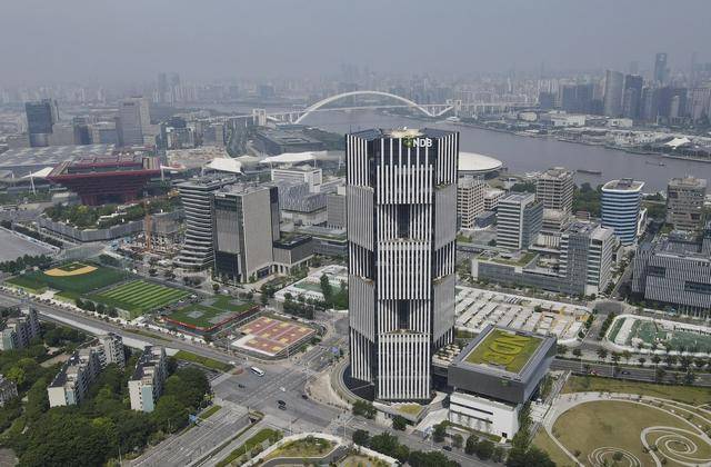 这是2022年6月17日拍摄的位于中国上海浦东新区世博园区的金砖国家新开发银行总部大楼(无人机照片)。新华社记者方喆摄