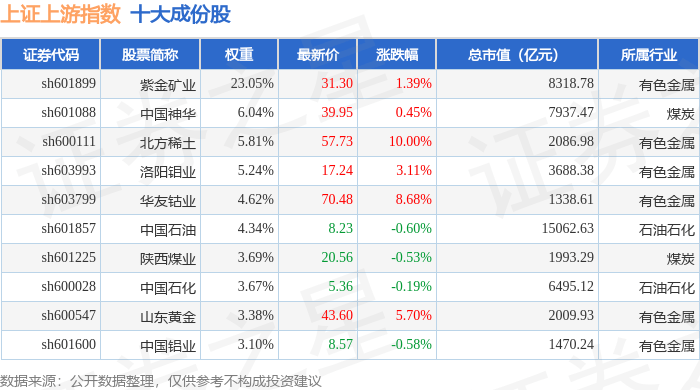 证券之星消息,10月13日,上证上游(000094)指数报收于4311.92点,涨2.21%,成交1137.86亿元,换手率1.2%。当日该指数成份股中,上涨的有20家,白银有色以10.04%的涨幅领涨,下跌的有24家,中国巨石以3.19%的跌幅领跌。
