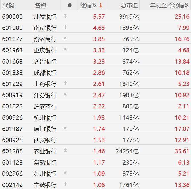 格隆汇10月13日|A股市场逆势上涨,其中,浦发涨超5%,涨超4%,渝农商行、重庆银行、齐鲁银行涨超3%,、、、沪农商行涨超2%。消息面上, “十一”假期前,发布公告称,东方资产通过二级市场购入普通股及可转债转股的形式增持该银行股份。