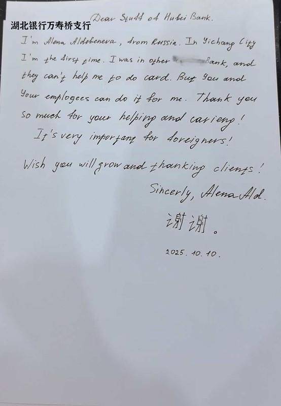 10月10日,湖北银行宜昌万寿桥支行收到了一封手写的感谢信,写信的是一位叫Alena Aldebeneva的俄罗斯女士。她不会想到,自己这一次在中国办银行卡的经历,会成为一桩值得提笔感谢的温暖回忆。