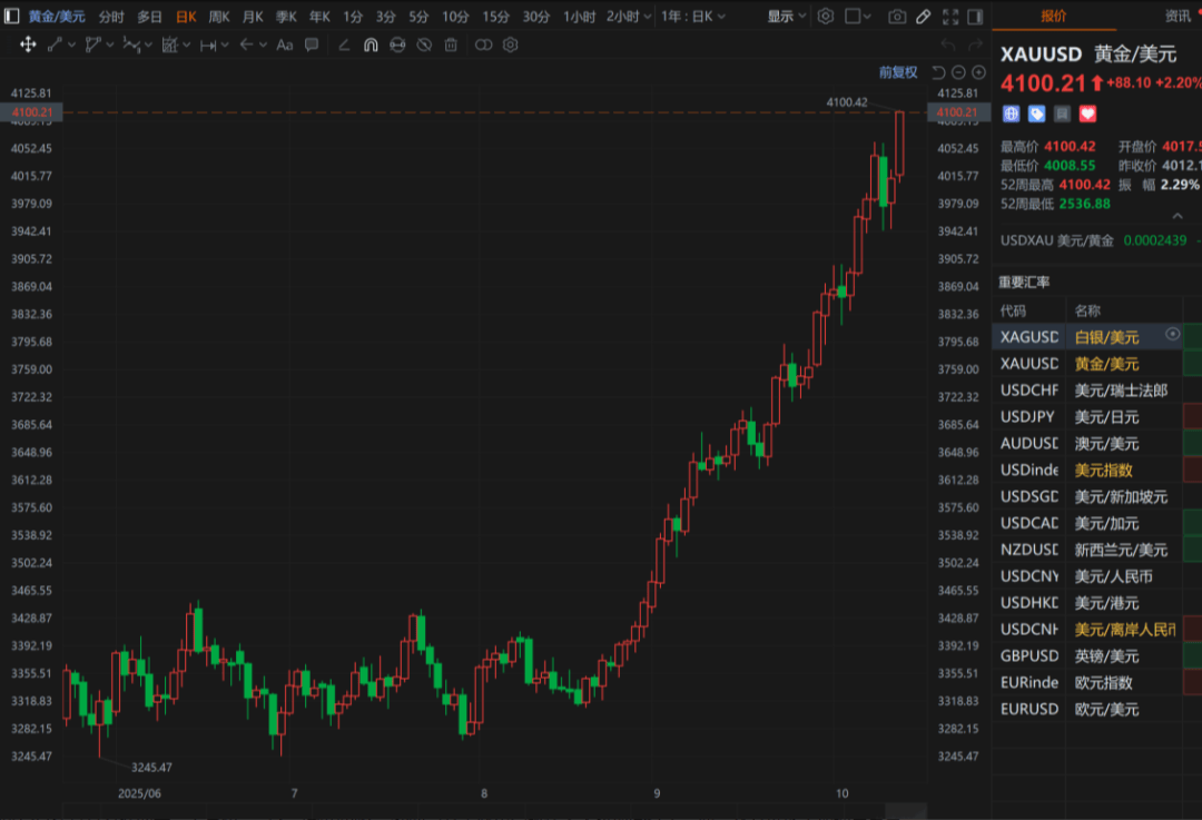 10月13日晚,现货黄金日内涨2.2%向上触及4100美元/盎司,再创历史新高。今年以来,现货黄金累计涨1475美元/盎司,累计涨幅达56%。截至发稿,现货白银涨3.34%,报51.93美元/盎司;沪金期货主力连续合约涨2.28%,报935元(人民币)/克。