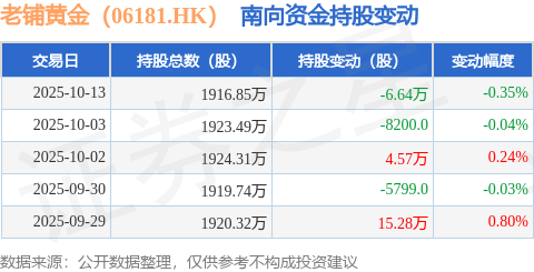 证券之星消息,10月13日南向资金减持6.64万股老铺黄金(06181.HK)。近5个交易日中,获南向资金增持的有2天,累计净增持11.81万股。近20个交易日中,获南向资金增持的有10天,累计净增持83.56万股。截至目前,南向资金持有老铺黄金(06181.HK)1916.85万股,占公司已发行普通股的13.73%。