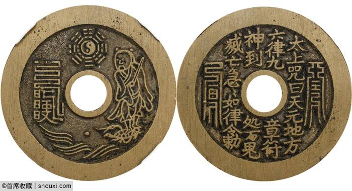 唐代日月金光背突厥文花钱,中乾-82,包浆醇厚,穿口洁净,650美元落槌;清代太上咒语老君八卦花钱,中乾-88,砂质细腻,钱文隽秀,1.6万美元落槌,含佣约合人民币13.73万元成交;清代太上咒语老君八卦花钱,中乾-85,痕迹轻浅,字口立体,700美元落槌;清代一品当朝状元及第花钱,中乾-85,铜色黄亮,字口峻拔,2400美元落槌。