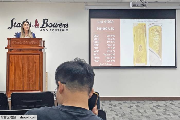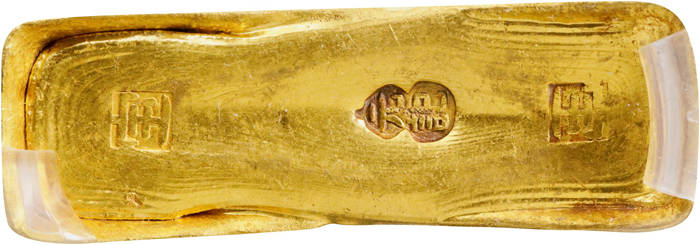 清代乾隆时期元记双宝字戳十两金条,中乾AU-58,365.3g,热门名誉品,戳记深打,金光熠熠,6.5万美元落槌,含佣约合人民币55.77万元成交;清代直隶万聚号十足色十两,中乾-AU53,381.5g,灰色包浆,铭文稍磨,2200美元落槌;清代广东东阜东造正记十两砝码锭,中乾-AU50,372.1g,宝面平整,包浆醇厚,1700美元落槌。