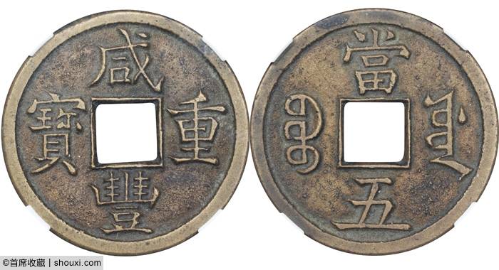 清代咸丰宝源当五母钱,GBCA-92,外郭精整,字口犀利,母钱风范十足,4.4万美元落槌,含佣约合人民币37.75万元成交;清代咸丰宝源当五母钱,GBCA-90,地章平整,笔划分明,2.4万美元落槌;清代咸丰宝源当五十,中乾-88,棕黄包浆,钱文流畅,1200美元落槌;清代咸丰宝陕当十样钱,中乾,外缘规整,包浆熟美,1900美元落槌;清代咸丰通宝一统天下宫钱,中乾-85,阔缘大字,外郭轻微磕痕,9000美元落槌。