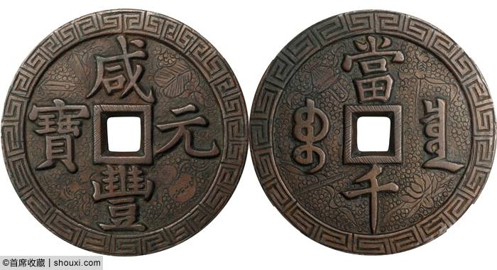 南宋嘉定元宝折十,GBCA-82,包浆熟旧,穿口方正,4800美元落槌;清代咸丰宝泉当十尔宝铁母,GBCA-88,地章平坦,笔划分明,1900美元落槌;清代咸丰宝泉当百,华夏-XF82,些许锉痕,包浆浓郁,700美元落槌;清代咸丰宝泉当千刻花,中乾,花纹精美,包浆温润,1.3万美元落槌,含佣约合人民币11.15万元成交。