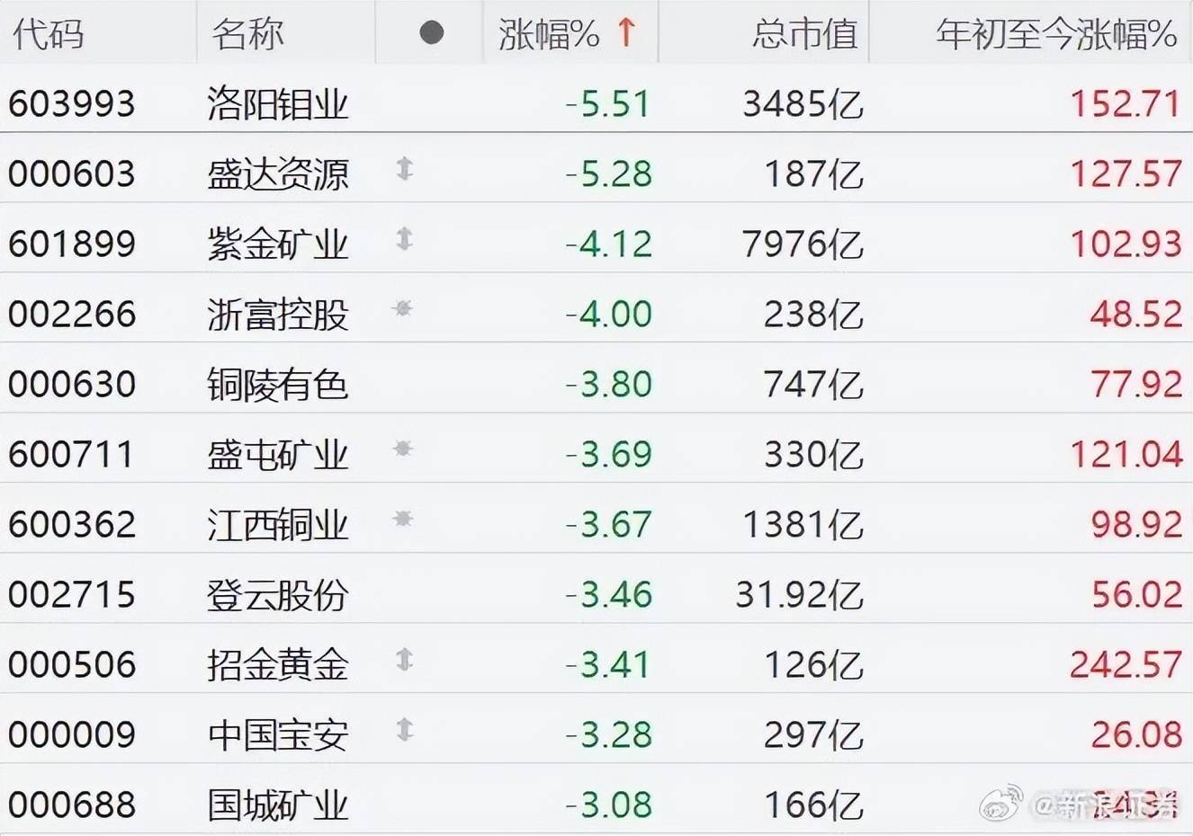 A股黄金股集体下跌,其中,洛阳钼业、盛达资源跌超5%,紫金矿业、浙富控股跌超4%,铜陵有色、盛屯矿业、江西铜业、招金黄金跌超3%。