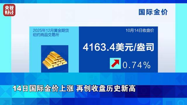 贵金属期货方面,因担忧全球贸易局势再度紧张,部分从风险资产撤离的资金涌向黄金避险,加之美国联邦政府“停摆”持续,市场对美联储未来继续降息的预期升温,国际金价周二上涨,再创收盘历史新高。截至收盘,纽约商品交易所12月黄金期价收于每盎司4163.4美元,涨幅为0.74%。