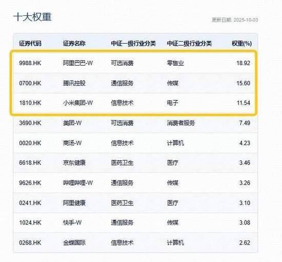 港股互联网ETF(513770)及其联接基金(A类017125;C类017126)跟踪中证港股通互联网指数,阿里巴巴-W、腾讯控股、小米集团-W是其前3大权重股,权重占比分别为18.92%、15.60%、11.54%,前10大持仓汇聚各领域互联网龙头公司,合计占比超73%,龙头优势显著,为港股AI核心标的。
