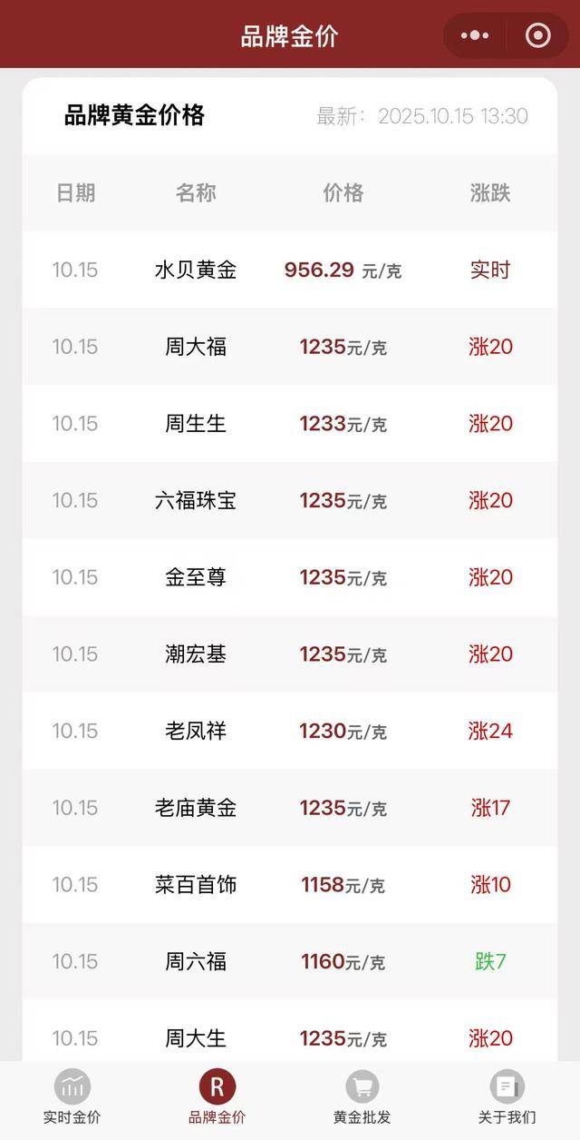 今年以来,国际金价持续攀升,屡创历史新高。截至发稿,伦敦金现涨至4186.74美元/盎司,今年以来,现货黄金价格涨超50%。与此同时,国内各品牌金饰克价也纷纷上涨。今日金价小程序显示,10月15日,周大福、周生生、六福珠宝、潮宏基等多个金饰品牌黄金价格较前日上涨20元/克,涨至1235元/克。老凤祥足金饰品标价则较前日上涨24元/克。