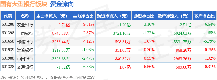 从资金流向上来看,当日国有大型银行板块主力资金净流入3.35亿元,游资资金净流出2208.99万元,散户资金净流出3.13亿元。国有大型银行板块个股资金流向见下表: