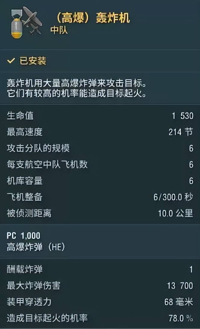 和只有一种飞机的科米萨尔、拉蒂格上将不同的是,希尔德布兰德的航空队由鱼雷机和传统轰炸机组成。其轰炸机堪称威力十足,标伤高达13700,还有68毫米的穿深和78%的点火率,甲板厚度57毫米的R系战列舰也能炸的动。散布圈也很不错,是高精度圆形散布,命中率很高。