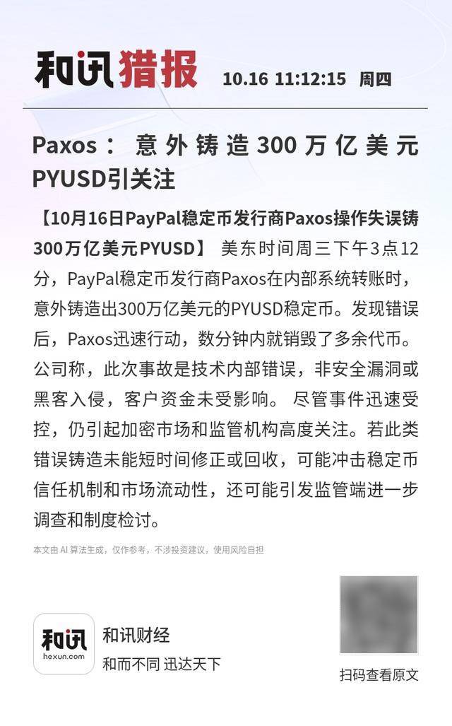 【10月16日PayPal稳定币发行商Paxos操作失误铸300万亿美元PYUSD】美东时间周三下午3点12分,PayPal稳定币发行商Paxos在内部系统转账时,意外铸造出300万亿美元的PYUSD稳定币。发现错误后,Paxos迅速行动,数分钟内就销毁了多余代币。公司称,此次事故是技术内部错误,非安全漏洞或黑客入侵,客户资金未受影响。 尽管事件迅速受控,仍引起加密市场和监管机构高度关注。若此类错误铸造未能短时间修正或回收,可能冲击稳定币信任机制和市场流动性,还可能引发监管端进一步调查和制度检讨。