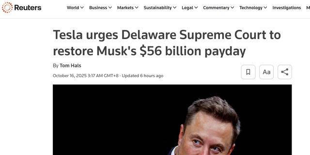 【环球网科技综合报道】10月16日消息,据路透社报道,特斯拉公司近日针对首席执行官埃隆·马斯克价值560亿美元的薪酬方案,向美国特拉华州最高法院提起上诉。这是该方案在两次获得股东投票支持却遭特拉华州衡平法院否决后,特斯拉为推动方案落地所做的又一重要举措。