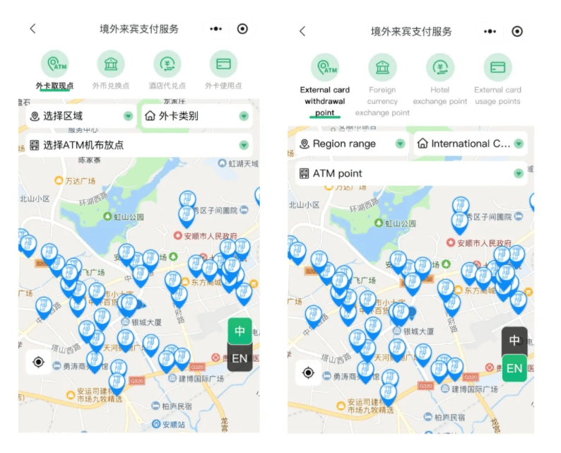 优化电子地图数智视窗。为帮助入境游客打破信息壁垒,获取及时、准确、完整的支付服务信息,人民银行安顺市分行与市文旅部门联动,依托入境游客常使用的地方文旅宣传小程序,上线“境外来宾支付服务”电子地图。电子地图精准标注各项支付服务信息并配备定位导航和中英文双语功能,实现支付服务便捷查。