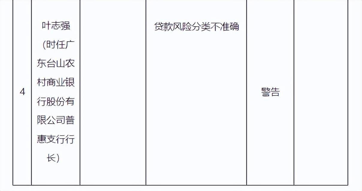 - 叶志强时任广东台山农村商业银行股份有限公司普惠支行行长,因其在任期间的相应职责,受到警告处分。