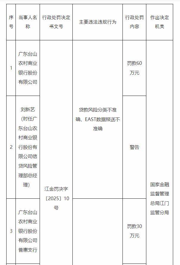 - 广东台山农村商业银行股份有限公司因存在贷款风险分类不准确、EAST数据报送不准确等问题,被国家金融广东台山农商行“栽跟头”:贷款分类与数据报送失误领90万罚单!监督管理总局江门监管分局处以60万元罚款。