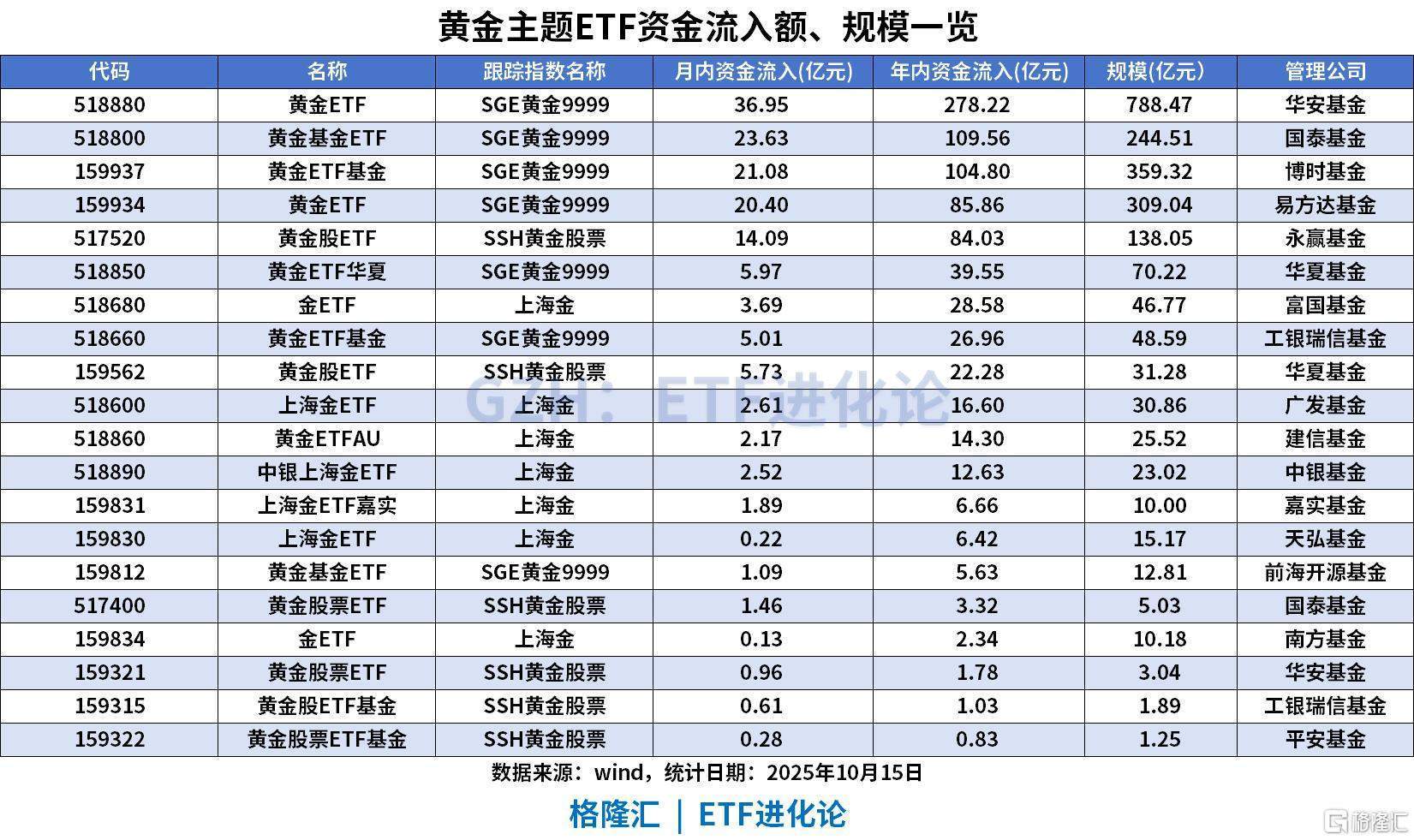 随着黄金市场不断走强,黄金主题ETF规模快速增长。Wind数据显示,截至10月15日,包含商品型和股票型在内的20只黄金主题ETF总规模2175亿元。