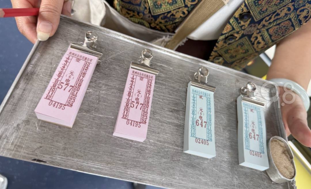 此次上线的30辆新无轨电车中,有4辆采用复古涂装的主题设计,分别为红、绿、蓝、白四种颜色,对应上世纪八九十年代至21世纪初杭州电车史上的四款经典车型,每一辆都堪称“行走的历史书”。除了外观复古,车内细节也充满时代感。4辆主题电车还设置了老物件展示区,展出“票夹”“公交月票”“车窗摇手柄”“老式公交车门铃控制按钮”等老物件,成为一个个“流动的博物馆”。