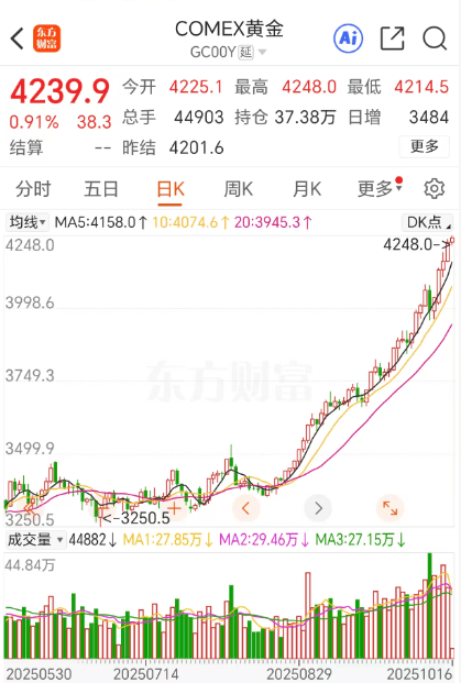 现货黄金周四早盘升破4220美元/盎司,连续4个交易日创下新高,本周累涨200美元。
