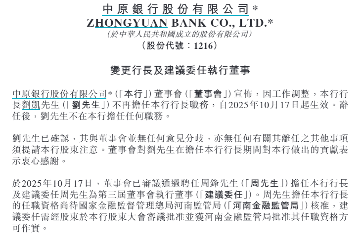 同日,中原银行董事会已审议通过聘任周锋担任行长及建议委任其为第三届董事会执行董事。