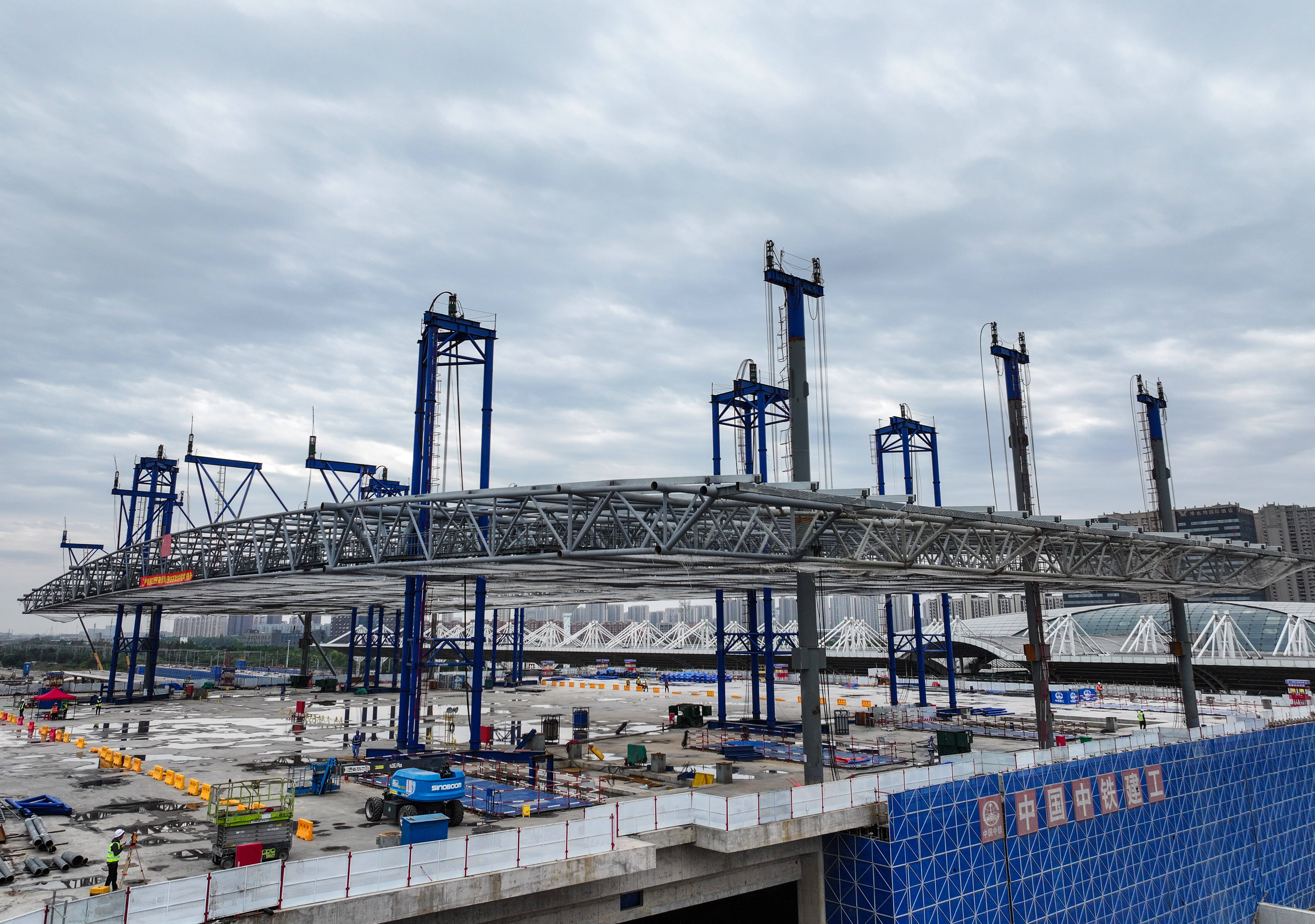 10月19日拍摄的新建上海至南京至合肥高速铁路南通站高架站房钢结构提升作业现场(无人机照片)。 新华社记者 季春鹏 摄