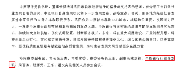8月14日,中原银行与河南省农业农村厅签约时仍标注为“行长”。8月28日,洛阳市委书记与中原银行董事长举行工作会谈的信息中,刘凯出席了活动,在河南地方官媒《河南经济报》的报道中,将刘凯头衔统称为“行领导”。
