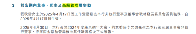与此同时,非执行董事层面也出现变动。4月17日,张秋云辞去中原银行非执行董事及董事会战略发展委员会委员职务后,转任中原证券(601375.SH)董事长。6月末,该行选举李文强接替张秋云原有职务。