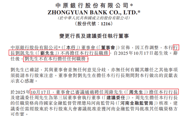 就在市场猜测该行行长是否将有变动时,中原银行紧接着就在10月17日发布公告,宣布原行长刘凯因工作调整不再担任行长职务,并在中原银行卸任了所有职位。同时,该行董事会已审议通过聘任周锋担任该行行长及建议委任周锋为第三届董事会执行董事。
