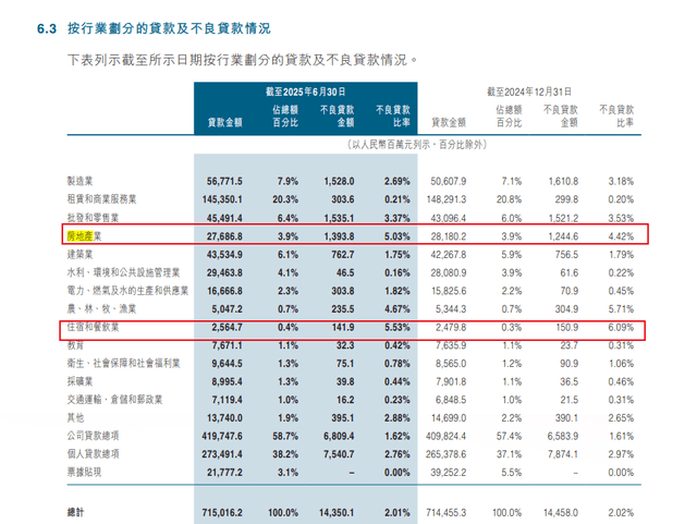 从上半年不良贷款行业分布看,住宿和餐饮业不良率最高,达5.53%,不过较2024年末的6.09%,已经明显下降。此外,房地产业不良贷款增长突出,从2024年末的4.42%升至5.03%,中原银行对此解释是市场需求下滑,企业债务到期压力较大。