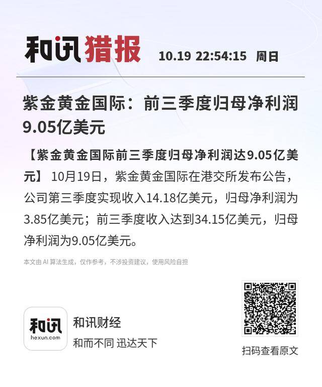 【紫金黄金国际前三季度归母净利润达9.05亿美元】10月19日,紫金黄金国际在港交所发布公告,公司第三季度实现收入14.18亿美元,归母净利润为3.85亿美元;前三季度收入达到34.15亿美元,归母净利润为9.05亿美元。